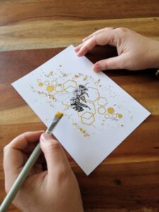 Le pointillisme, technique que j’affectionne particulièrement, se mêle à la délicatesse de la feuille d’or pour donner vie à des œuvres à la fois détaillées et lumineuses.