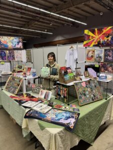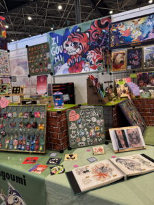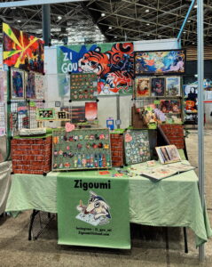 Pas de tatouage pendant la convention !!! Zigoumi préfère garder les aiguilles au chaud dans son atelier et profiter de ces événements pour papoter, partager son univers, présenter ses projets et discuter tranquillement de vos futures idées tattoo sans la pression du “vite, on pique” et les normes d’hygiène douteuses !
